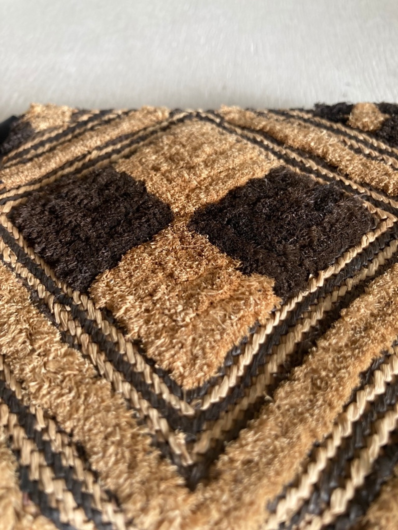 (パイル織の力強い印象の草ビロードを用いました。菱文のところパイル織に沿って同系色ながら織紋が入っているのが見所です。見方は人それぞれ、しかしながら、作り手の民にしか分かりえぬ各家々に継承された全てが吉祥を願う柄なのだそう。)