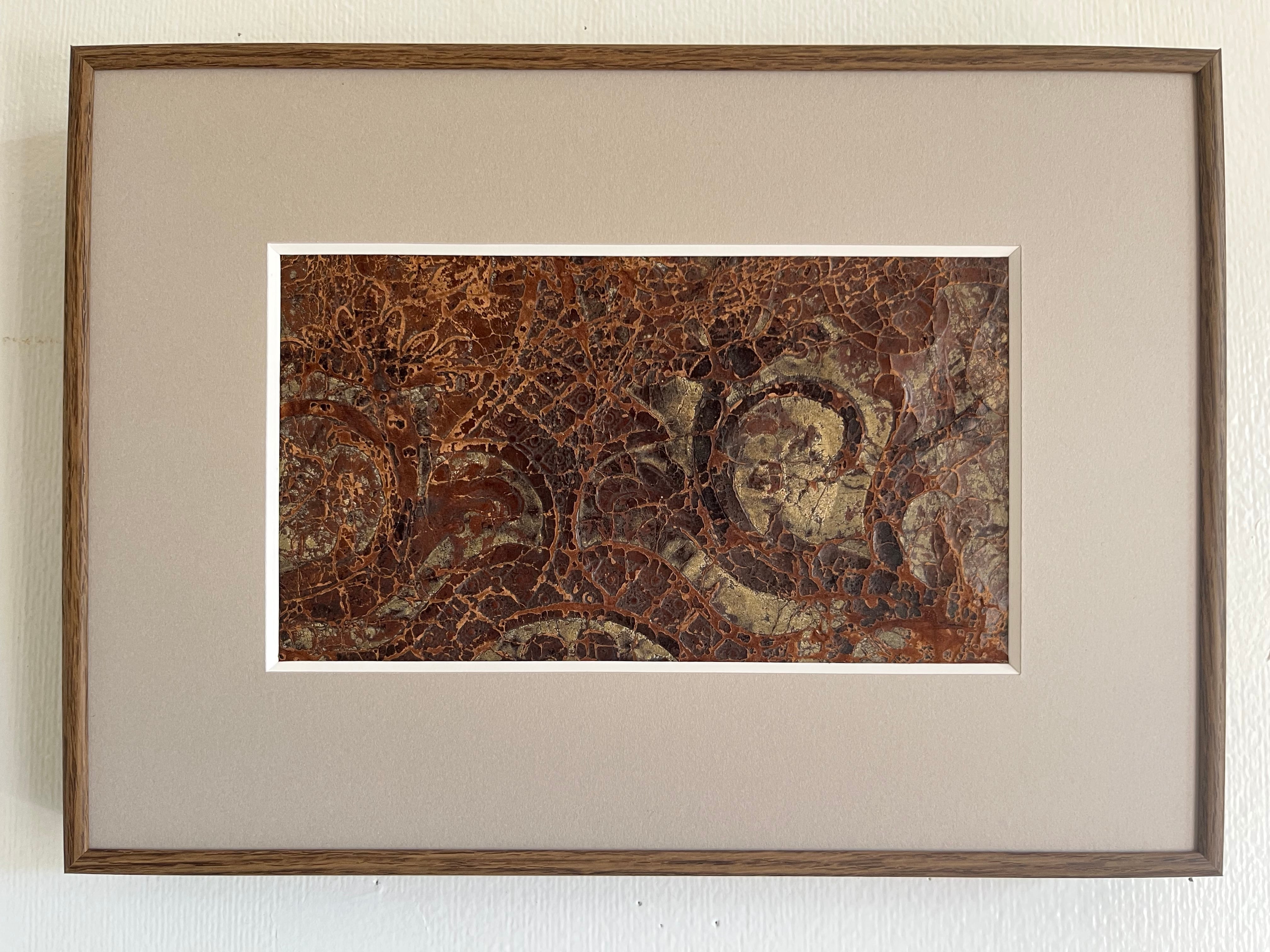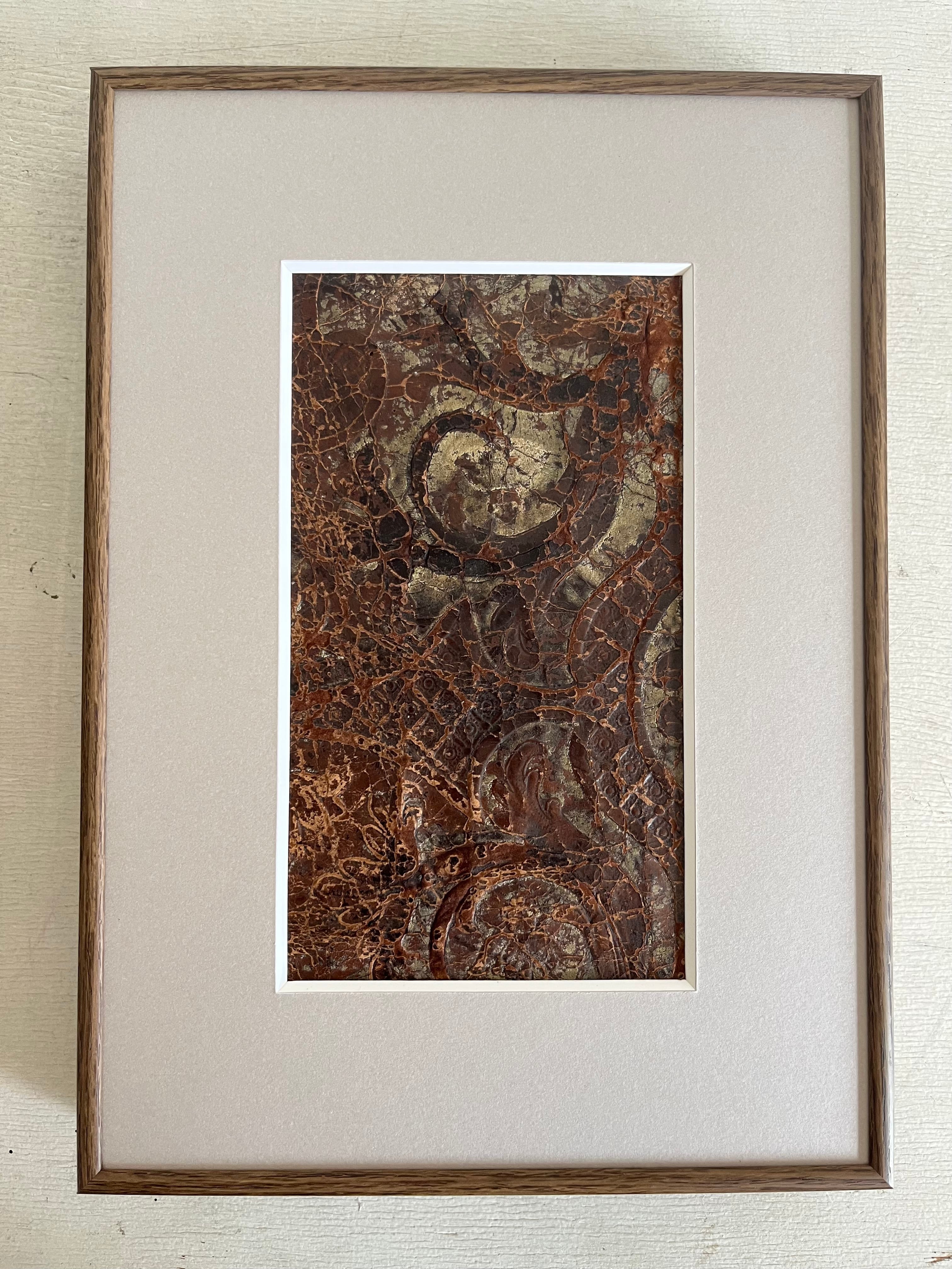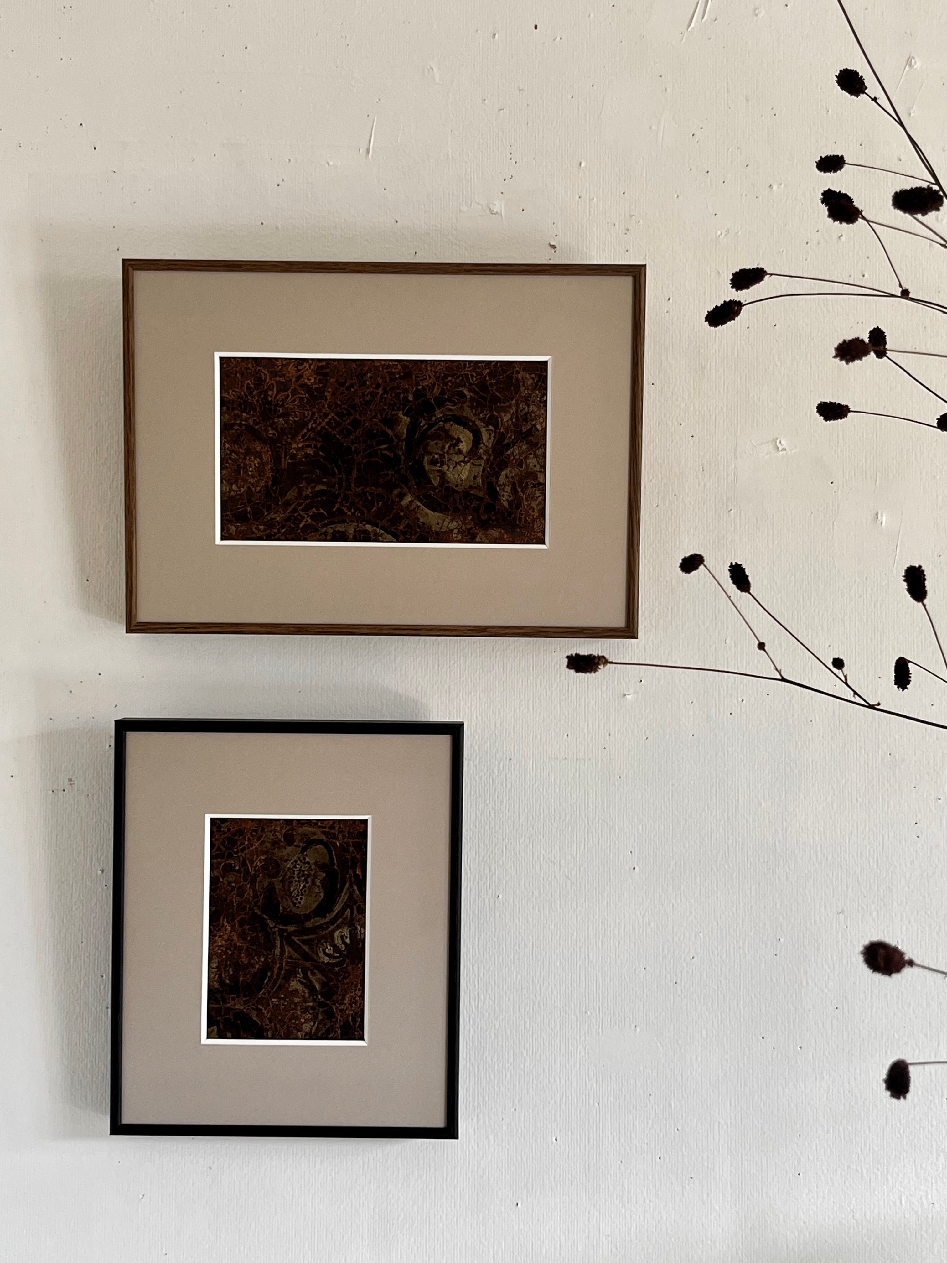 金唐革の魅力をたたえる箇所を弊店にてトリミングし額装へと仕立てたもの