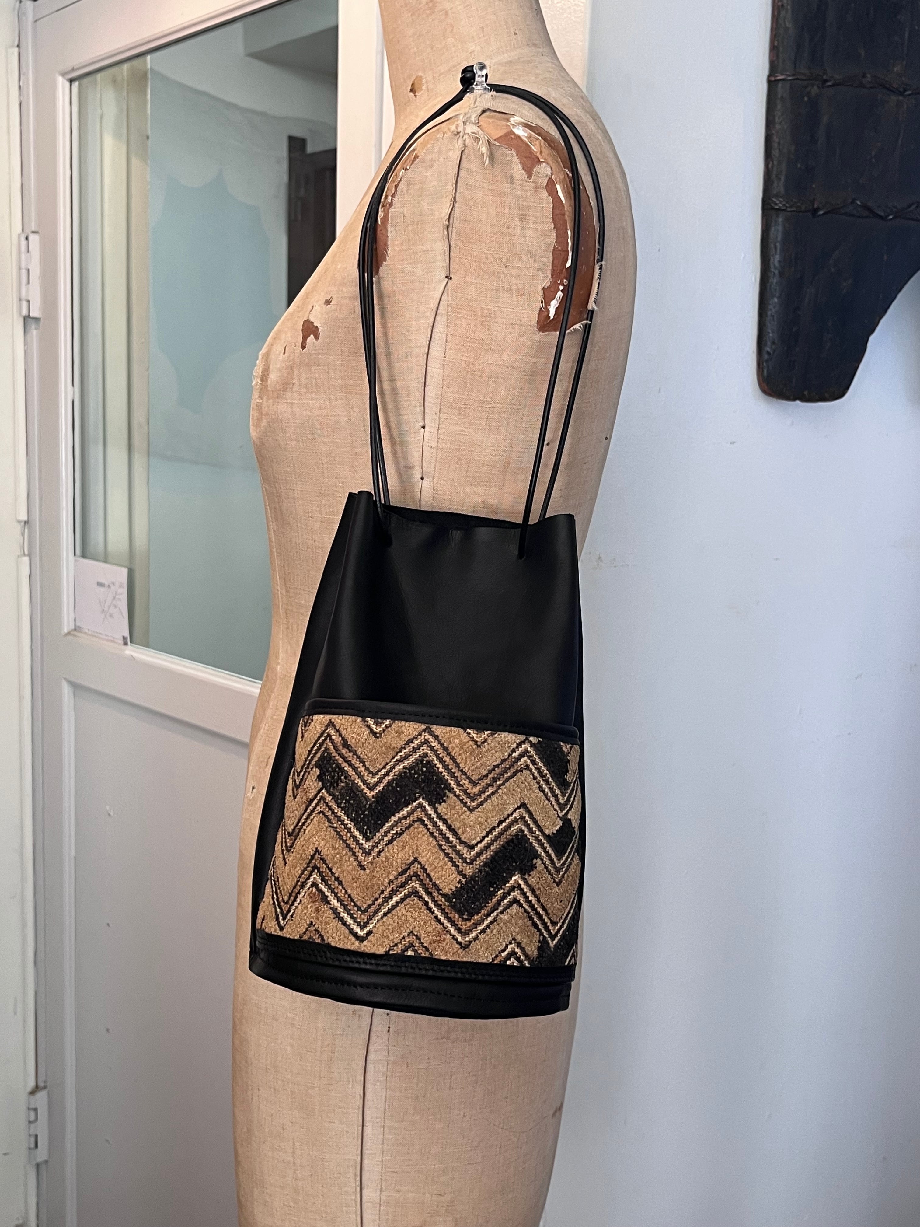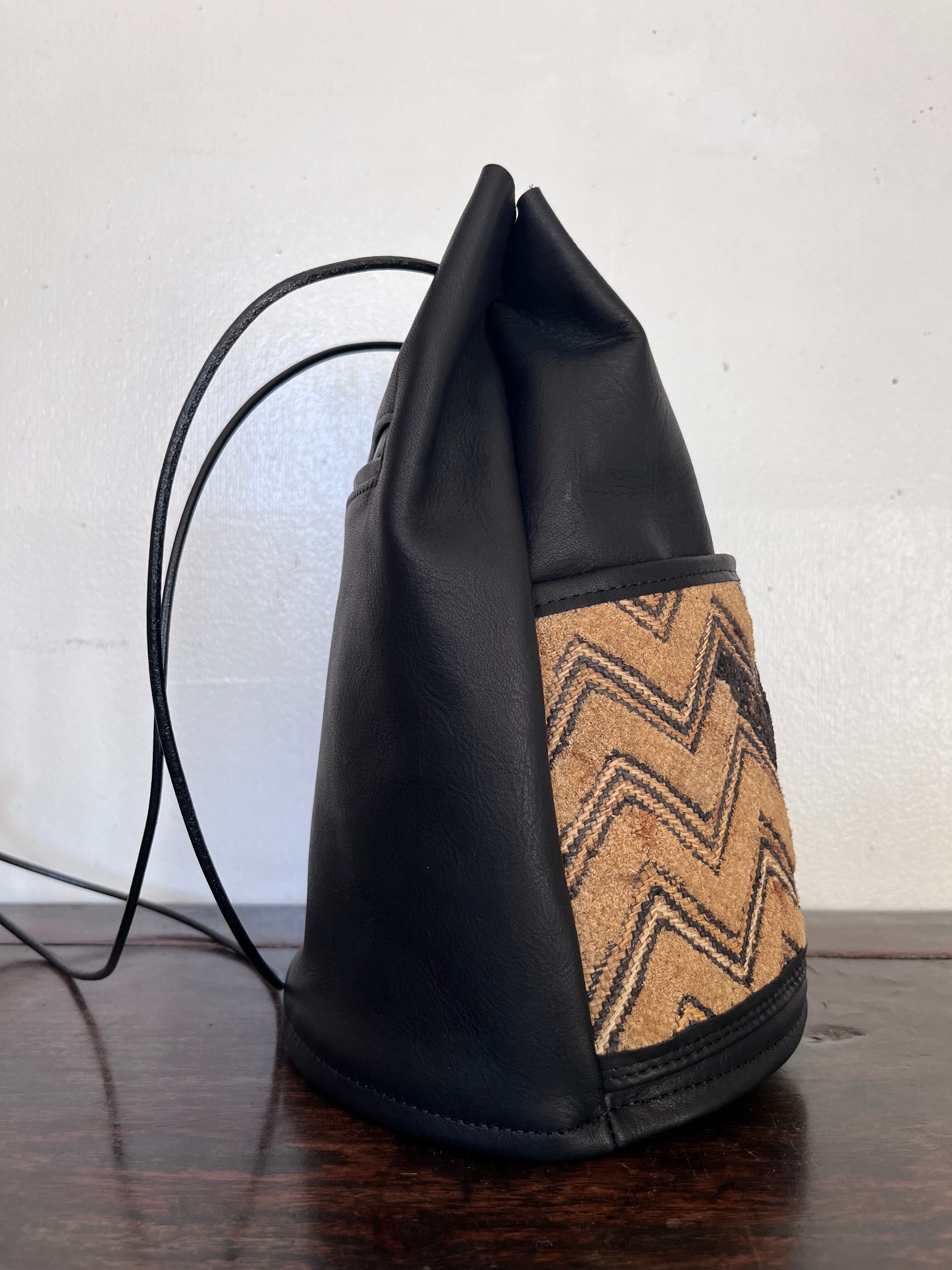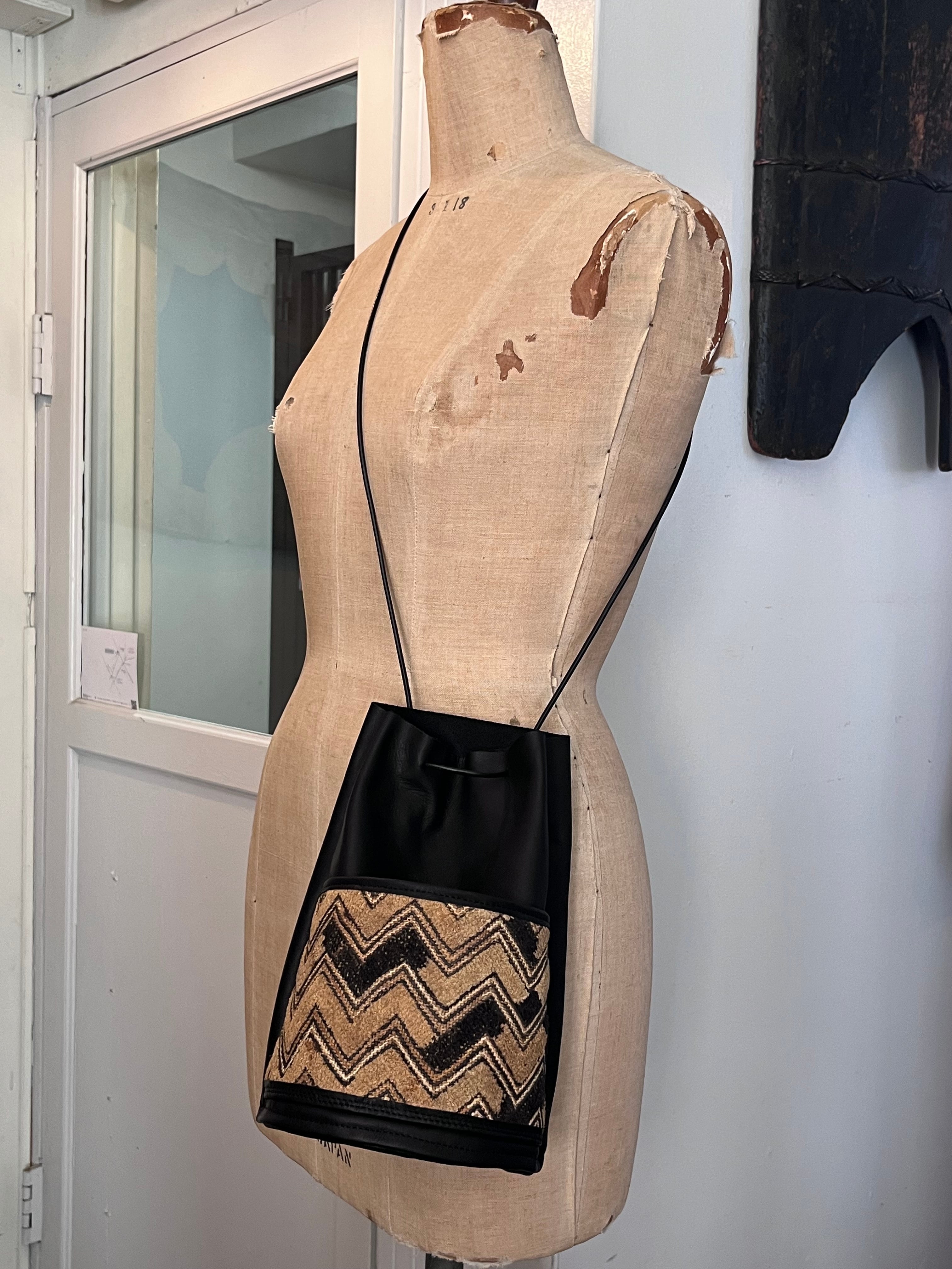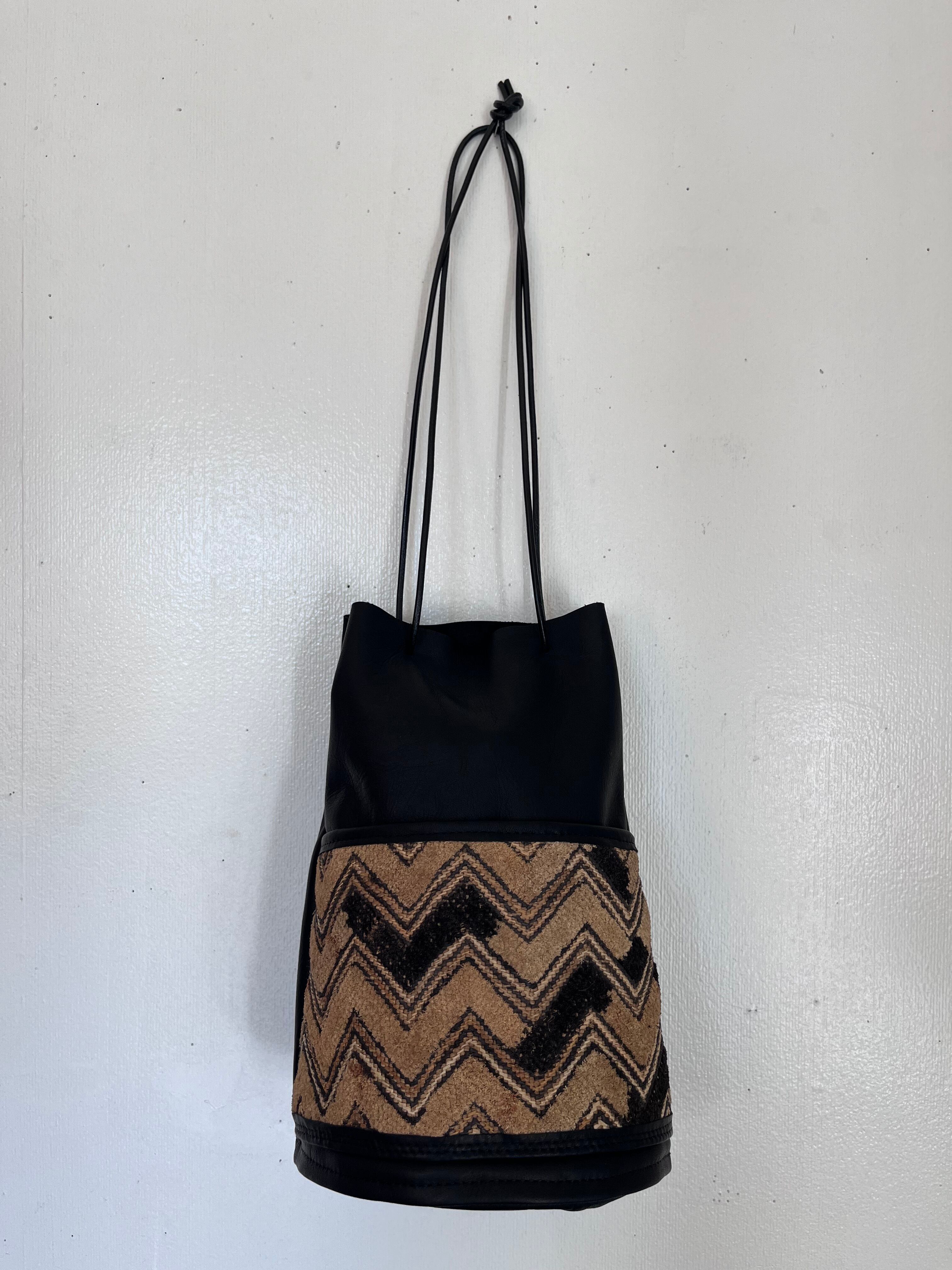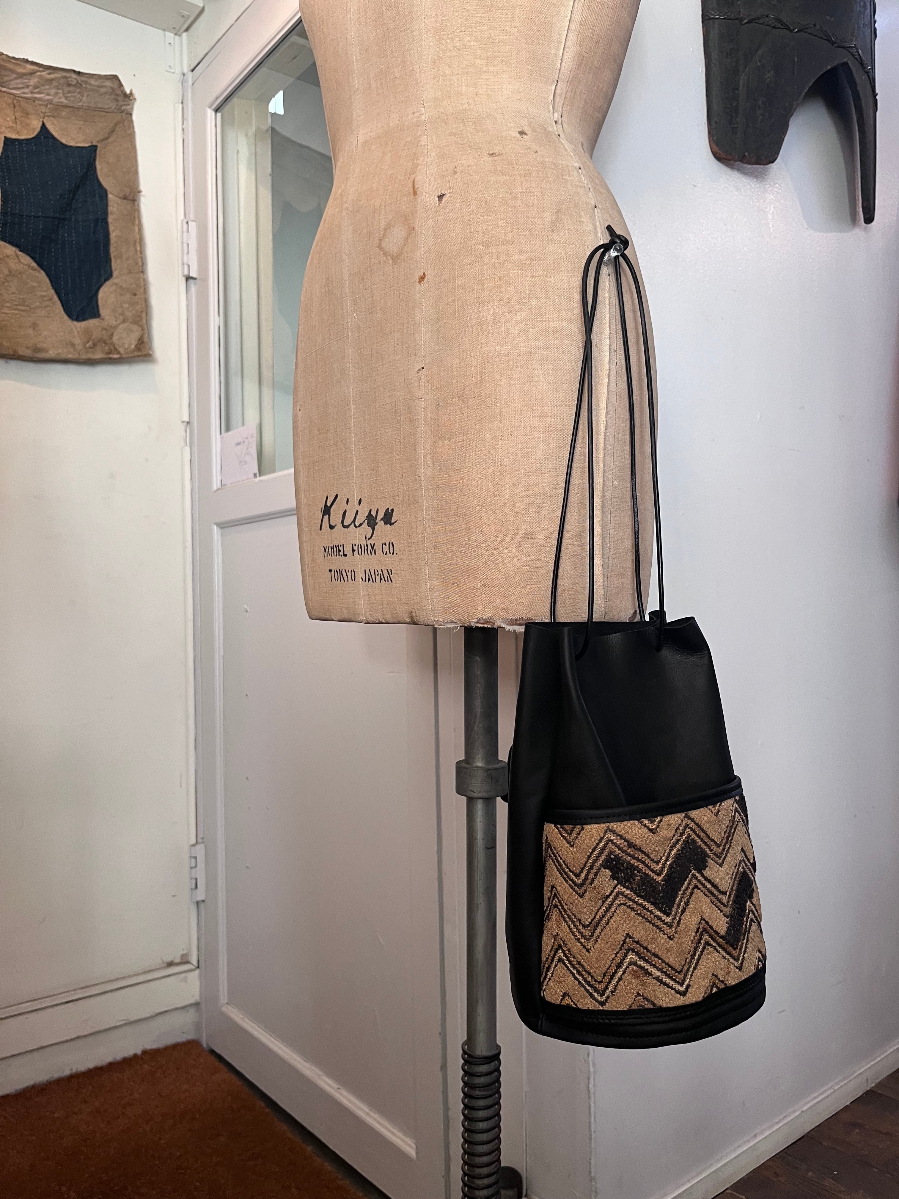 ヴィンテージの * 草ビロード を外ポケット兼装飾として取り入れたシンプルな巾着バッグ