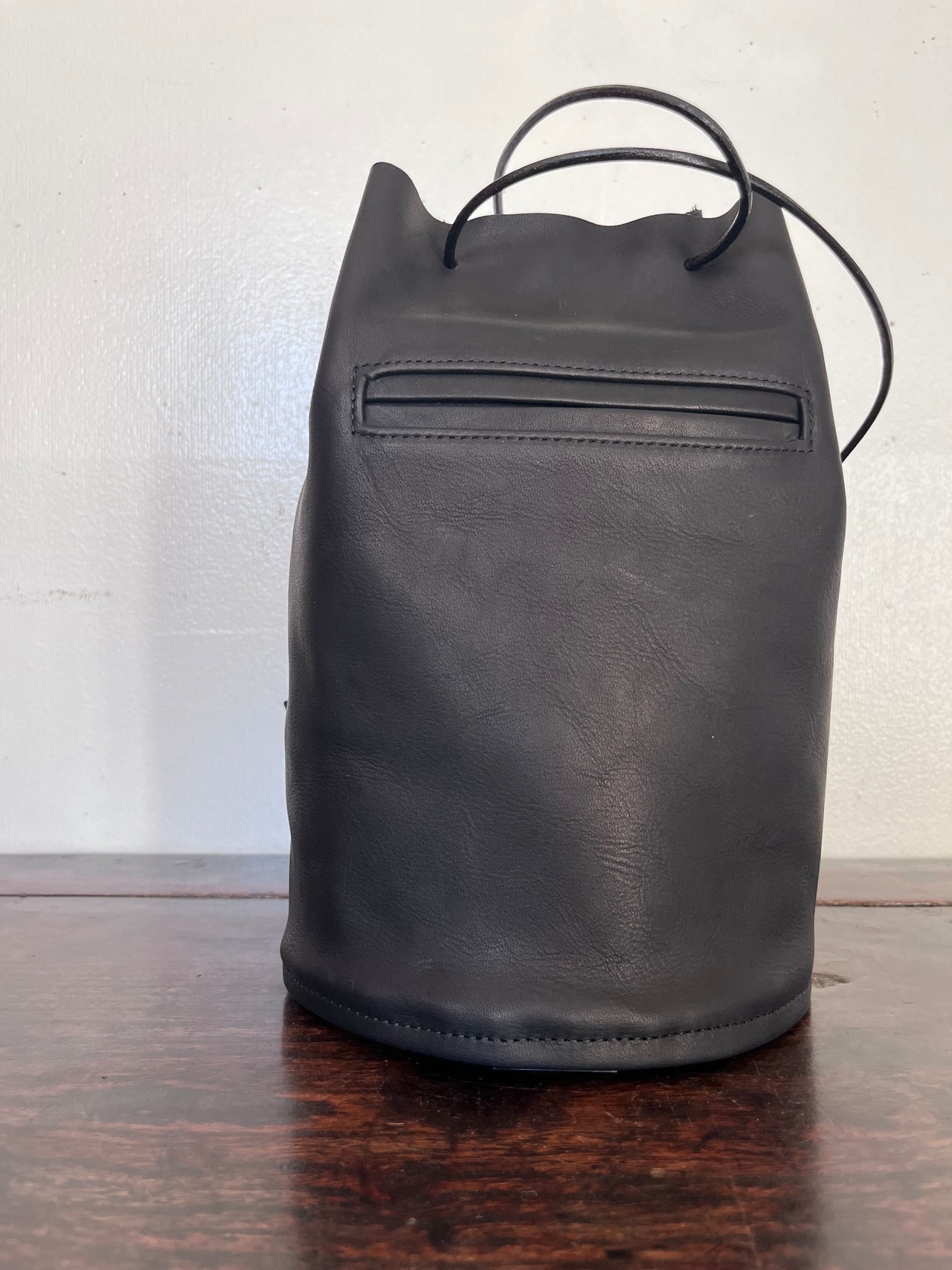 これ以上ポケットを深くするとBag本体の肩が張ってしまい口紐を閉めた折にドレープが美しく出ないこと、ミニマルサイズの携帯をお使いの方が取り出しにくくなってしまうため、ポケットに収まらぬサイズの大きな携帯をお使いの場合には、bag本体に収納していただくなどでご対応願います、悪しからず。