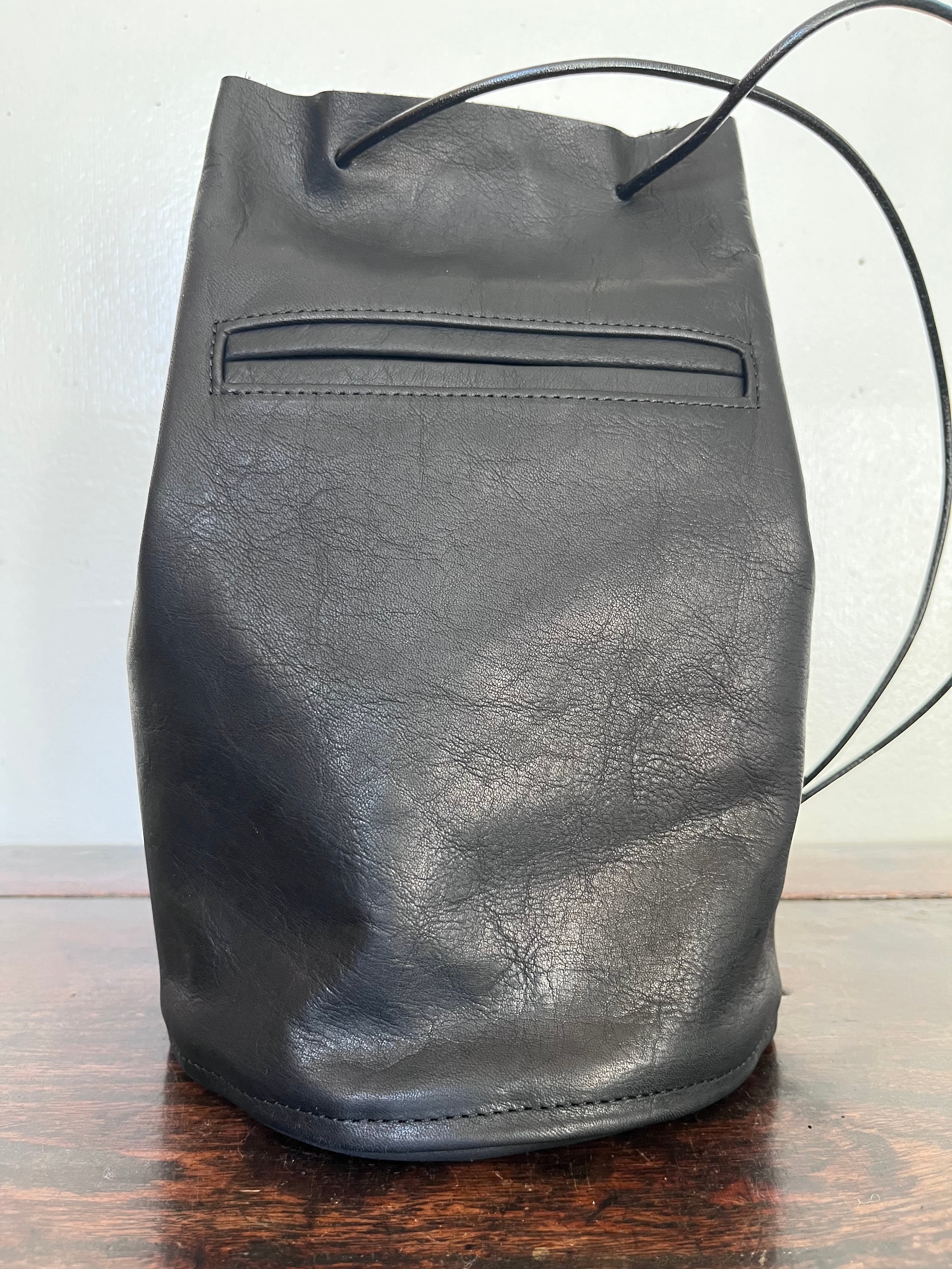 これ以上ポケットを深くするとBag本体の肩が張ってしまい口紐を閉めた折にドレープが美しく出ないこと、ミニマルサイズの携帯をお使いの方が取り出しにくくなってしまうため、ポケットに収まらぬサイズの大きな携帯をお使いの場合には、bag本体に収納していただくなどでご対応願います、悪しからず。