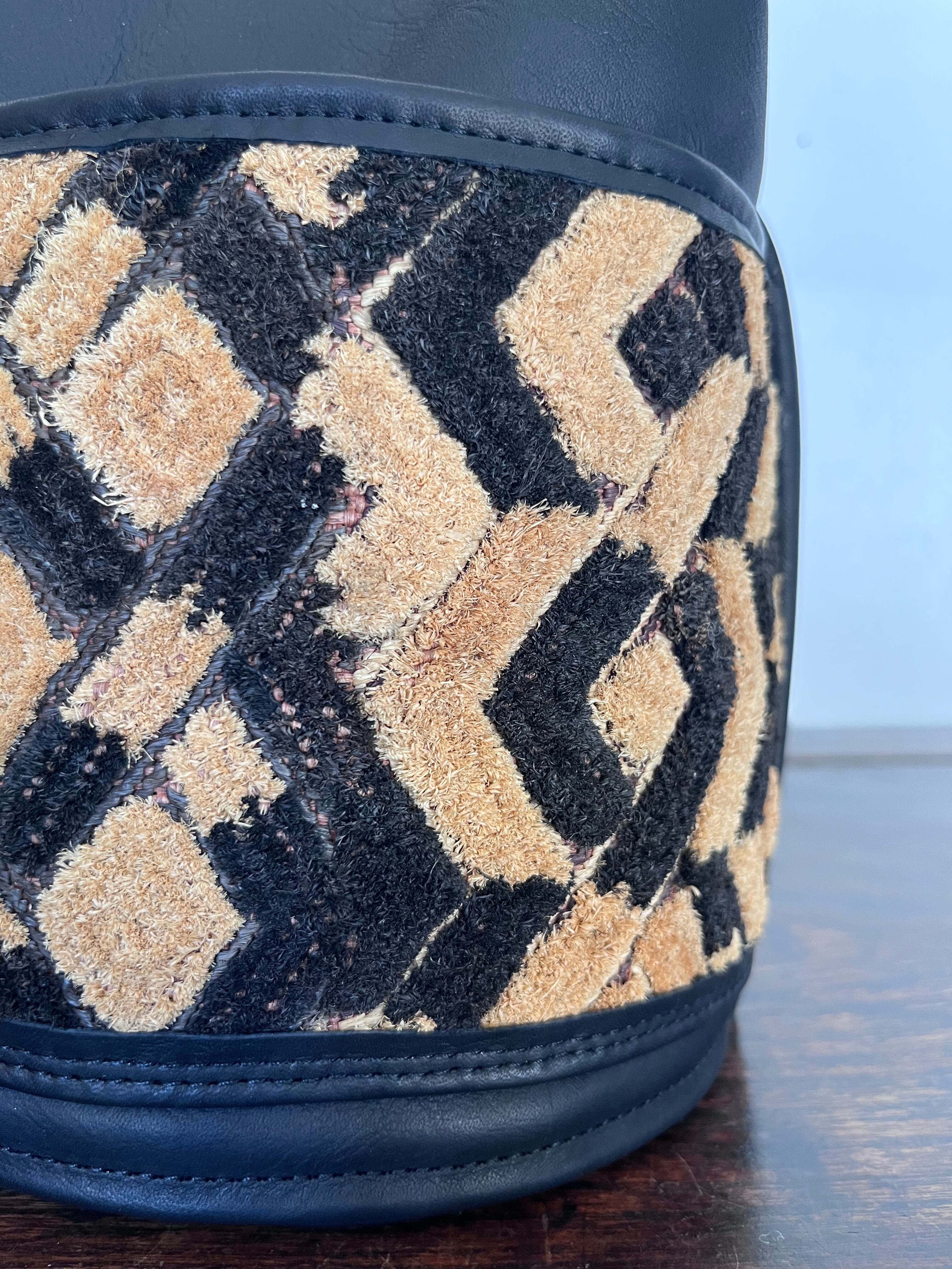 ヤシの葉から糸を績み染め平織りした地布に、同じく手績みのラフィア糸で刺繍又はパイル織により加飾がなされています。