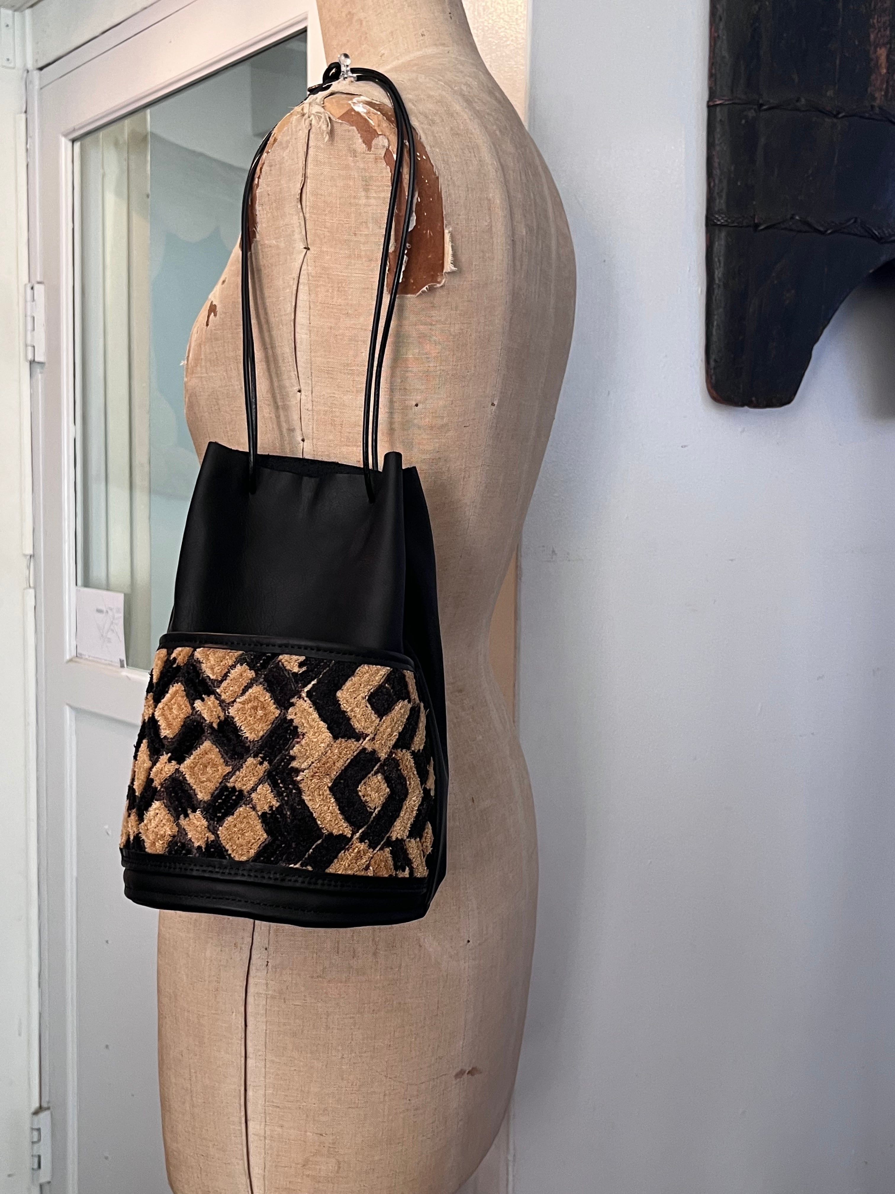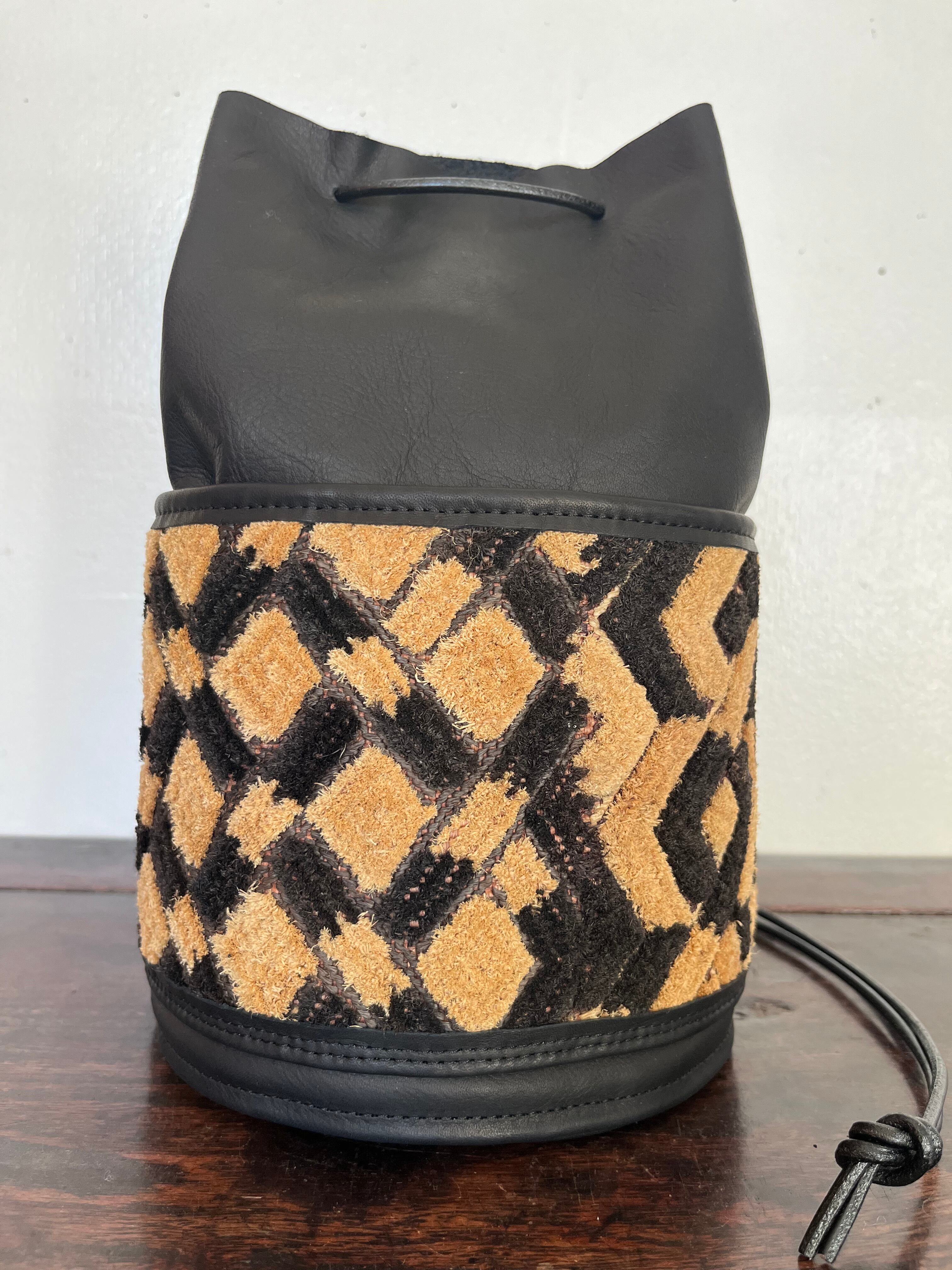 ヴィンテージの * 草ビロード を外ポケット兼装飾として取り入れたシンプルな巾着バッグ