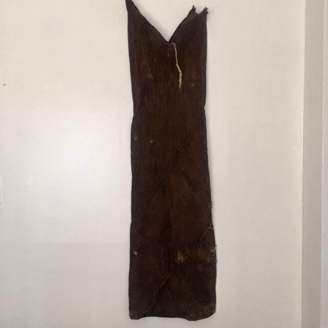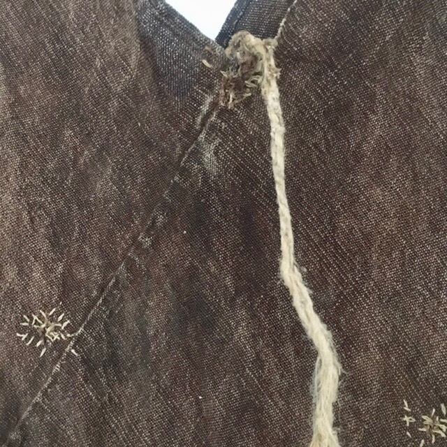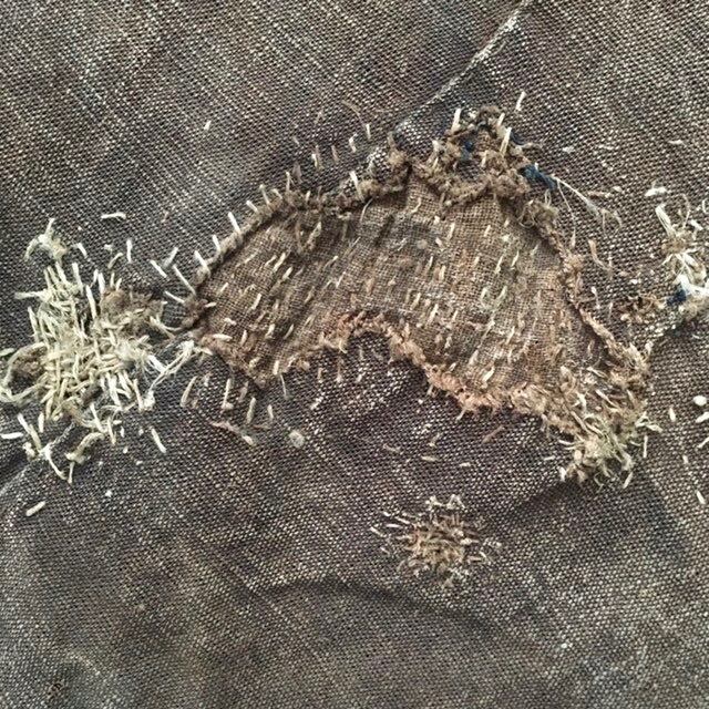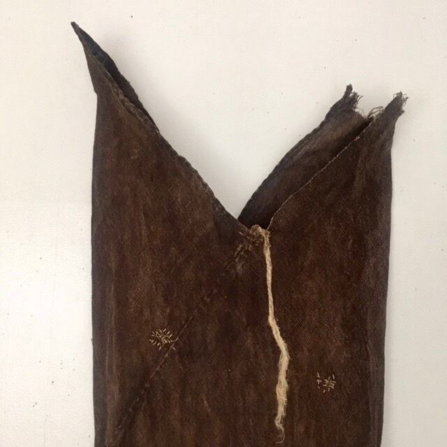 所々に見られる継ぎ接ぎ、補強の縫い跡、口元を結んで使用した事を残す柿渋の褪色。