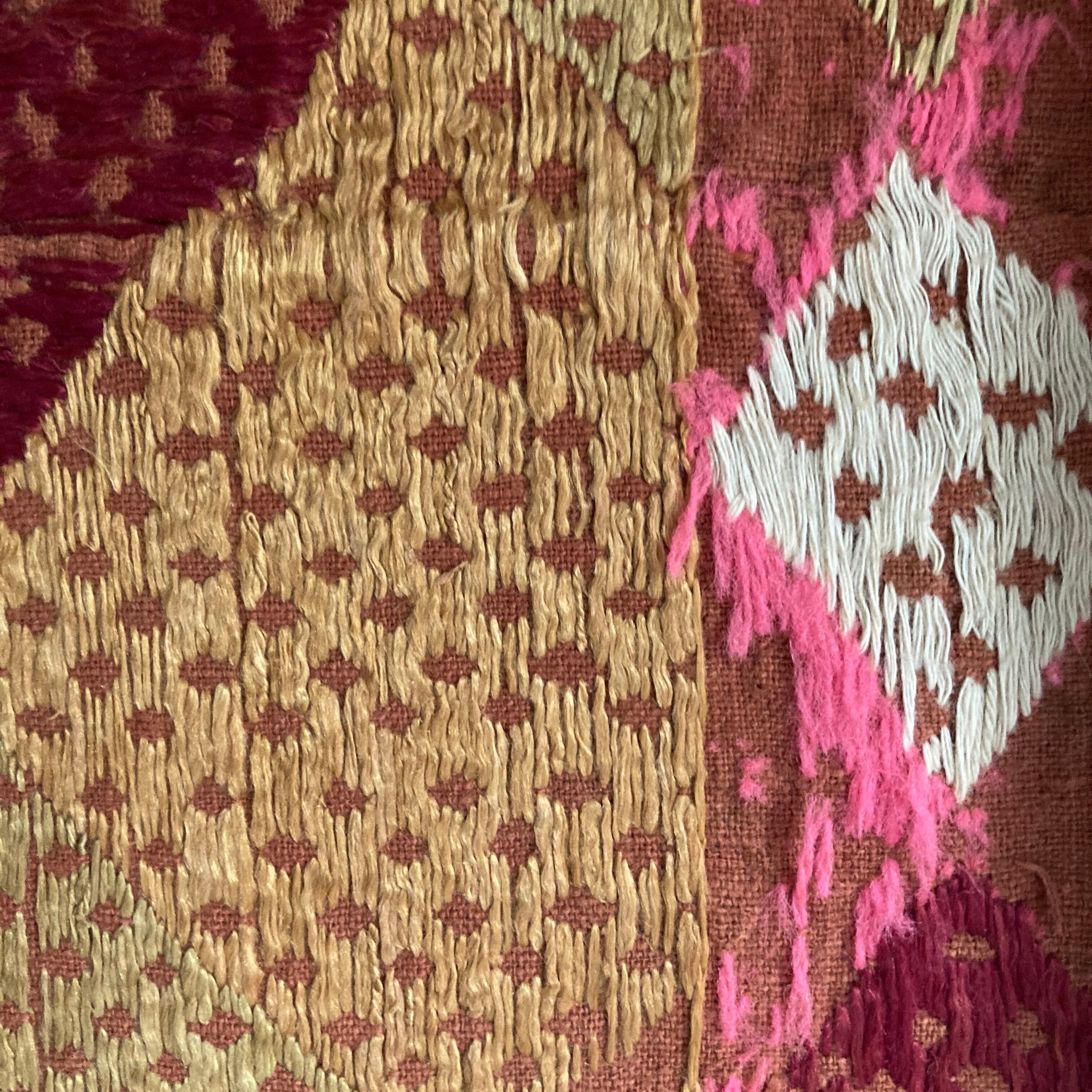 ソホ色のカダール(手紡ぎ木綿)の目を拾いながら、茜やザクロ或いはウコンなどから頂いた天然の染料による生糸(絹)と