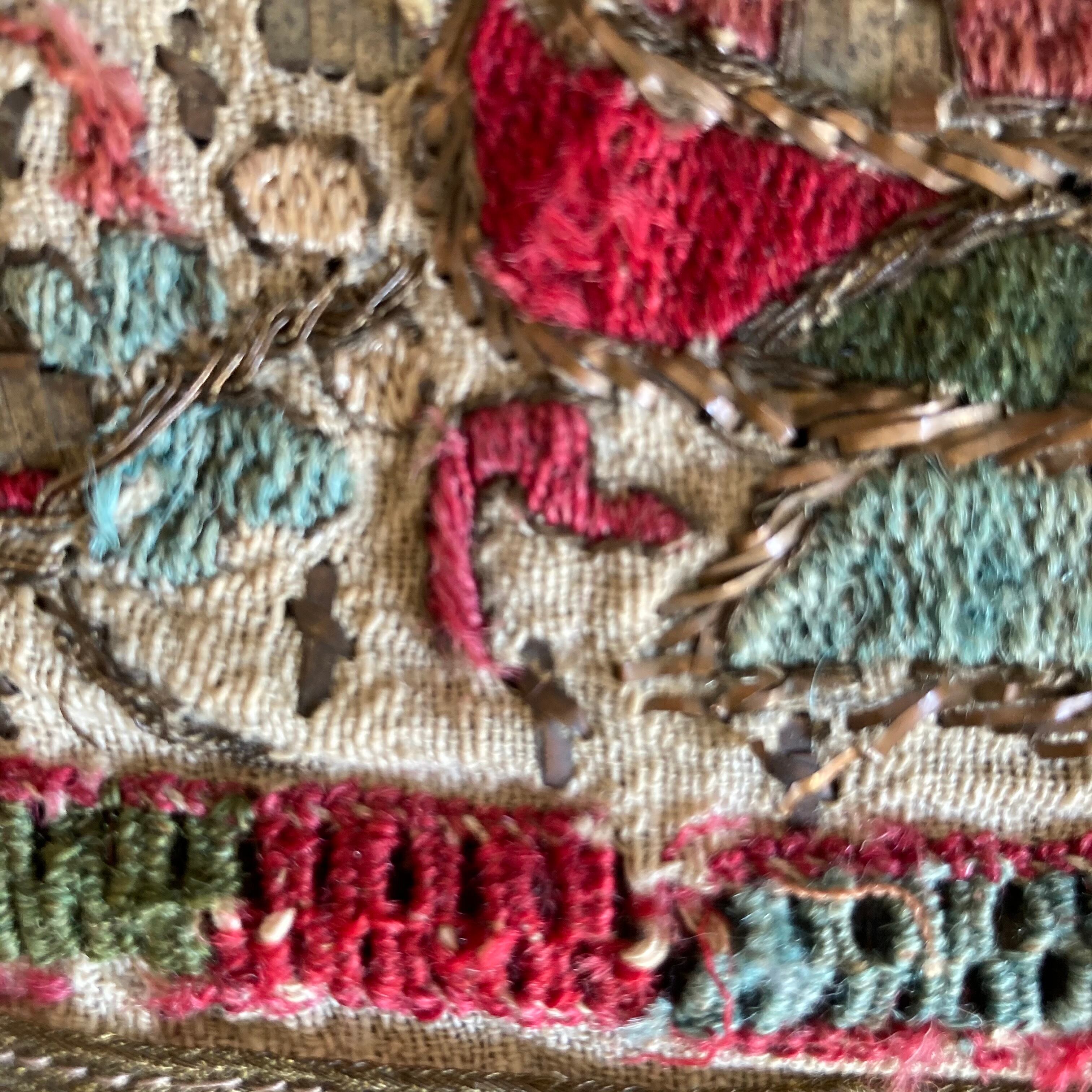 インド発祥と思しきメタルワーク(板状に切り出した黄銅で布の織り目を拾って加飾されています)と、中央アジアのスザニ刺繍に通づるステッチ、