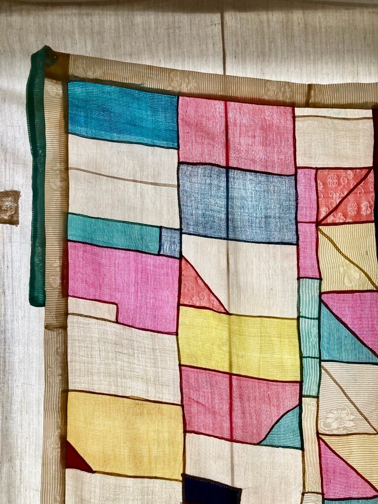 直射日光に晒しての長時間の使用はヤケなどによる退色を招きますのでご留意くださいませ、こういった色入りのポジャギは壁面や間仕切り等で、その色彩の取り合わせの妙を画としてお愉しみ頂くのもおすすめです。人が側で動く度にポジャギもはらりと揺らめきます。