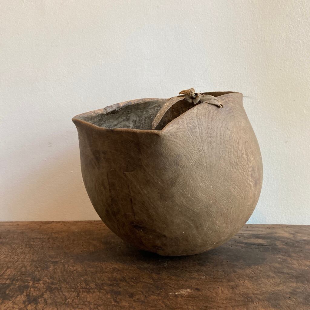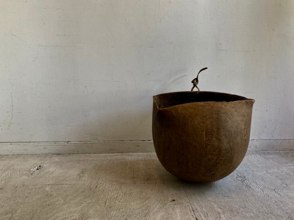 作られた当初のオリジナルと思われる、未だ強度を保つ革紐が口元に残っていますので、上手に利用して壁に掛け、そのフォルムを多角的に愛でて頂くのも良いかと思います。
