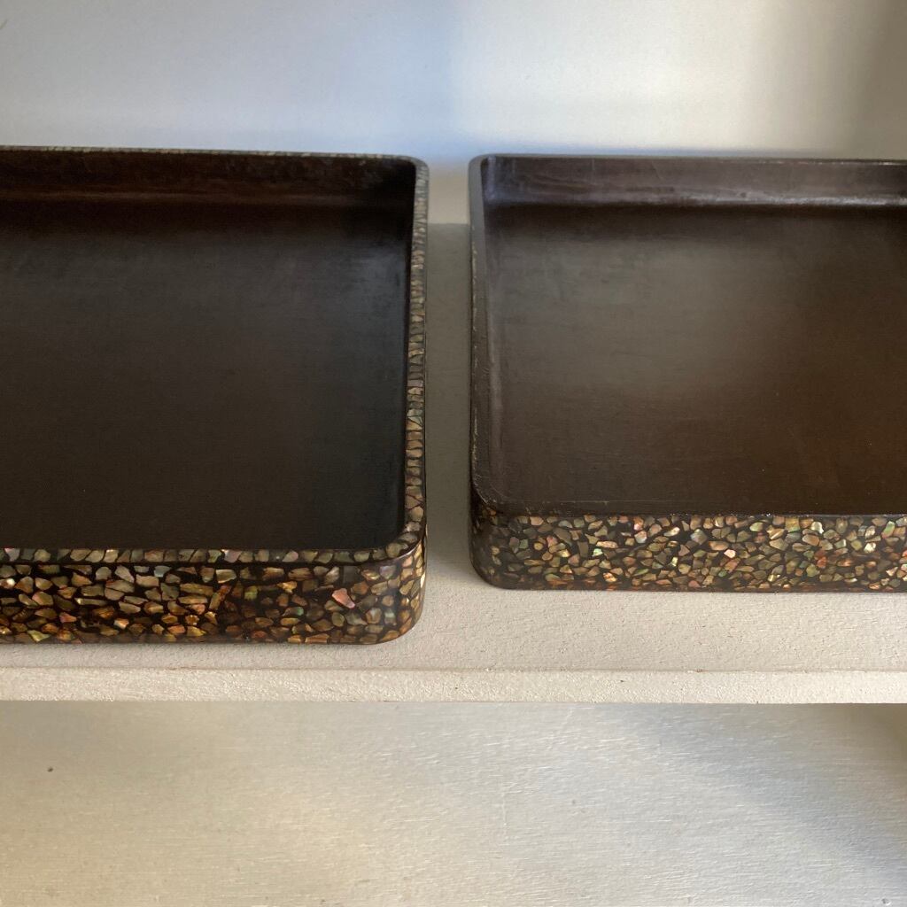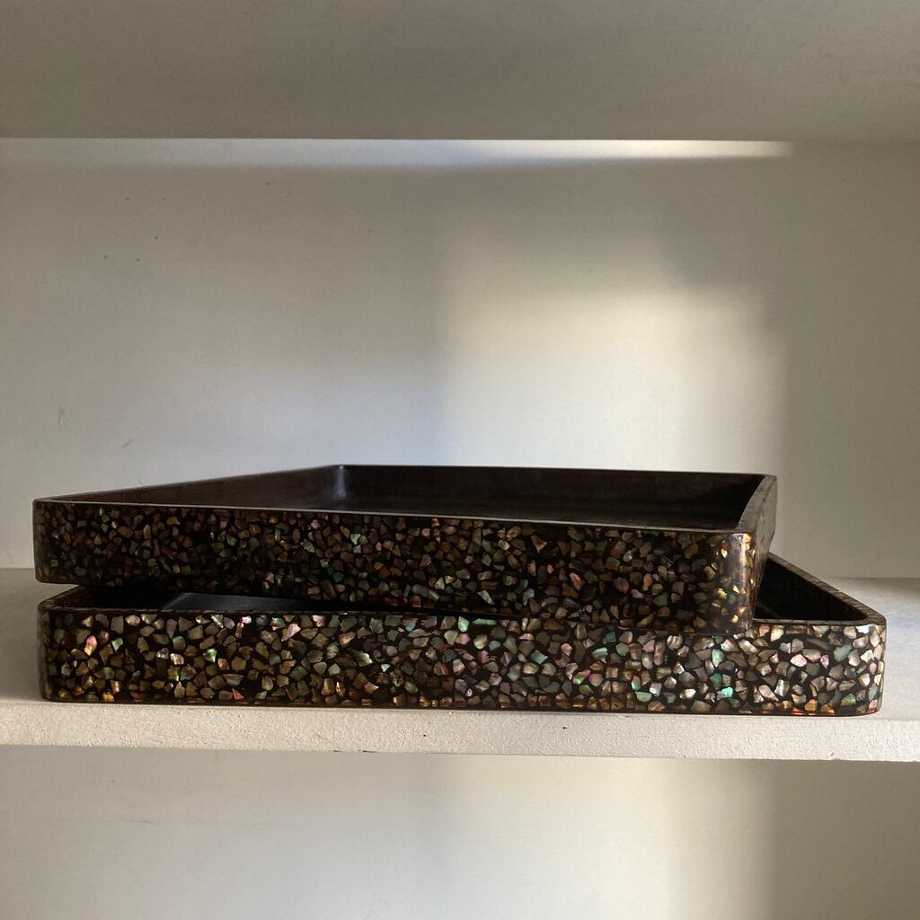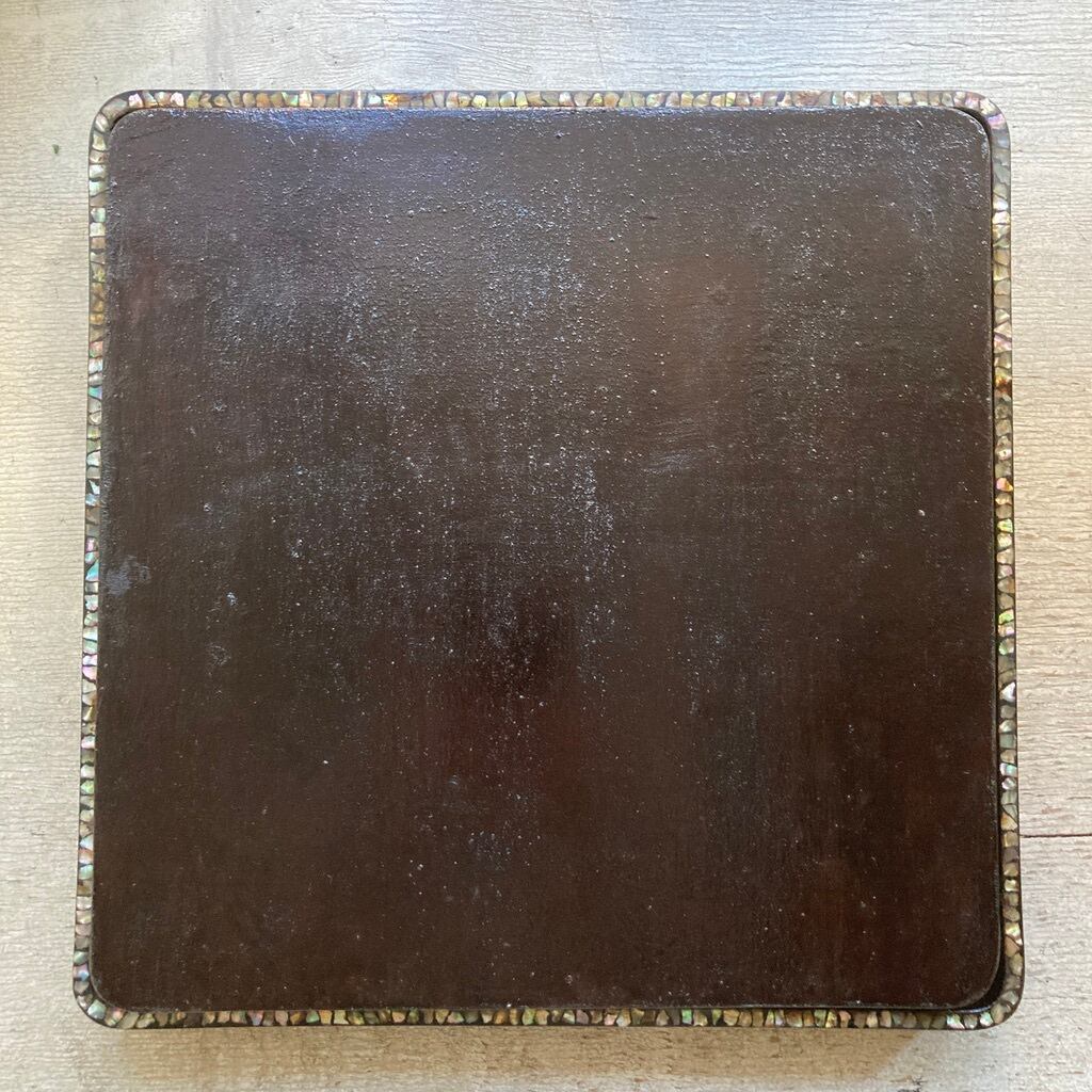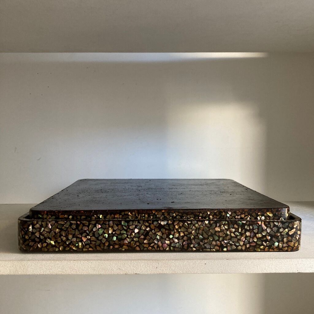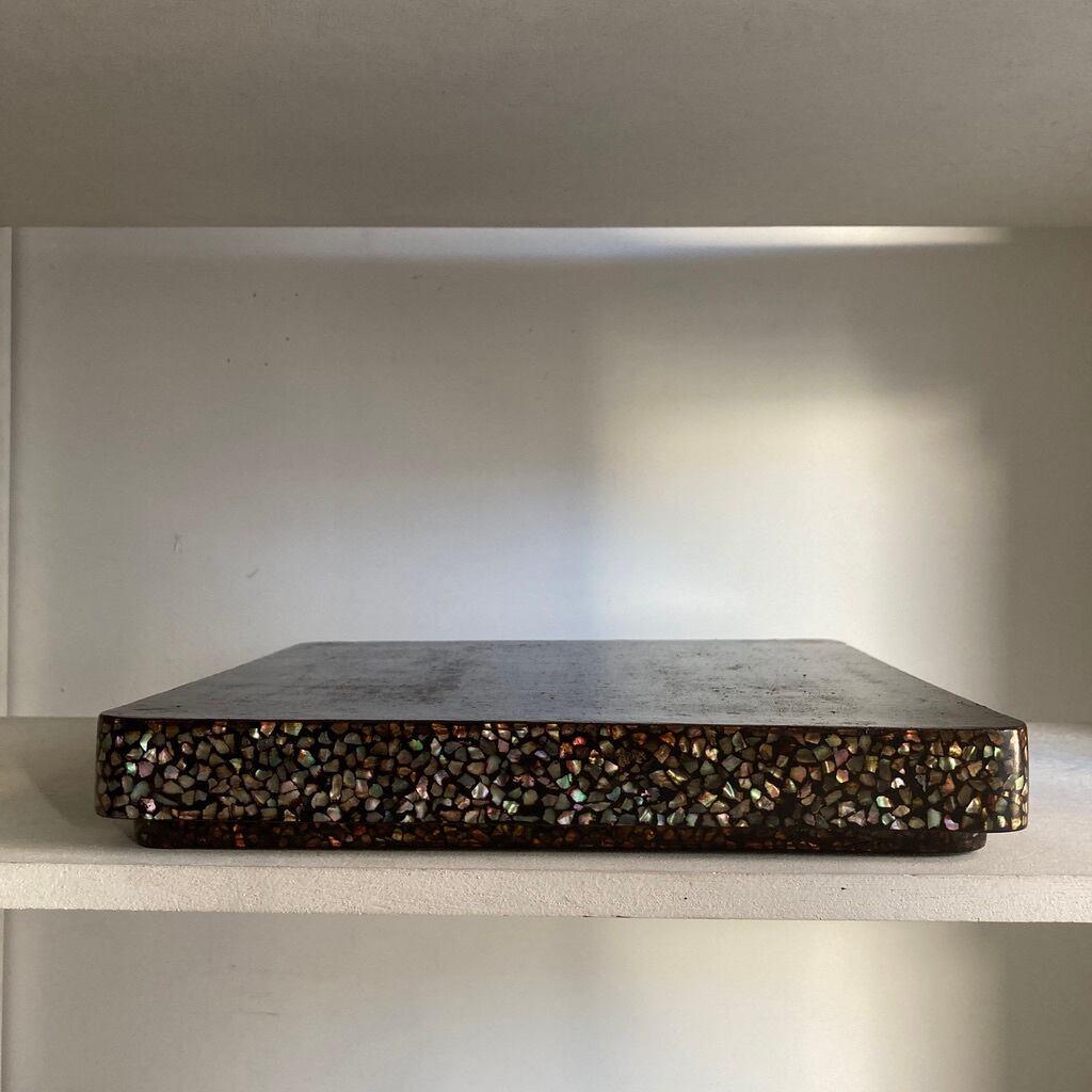 ■ 蓋(大きい方:縁に螺鈿あり)→ 私的にですが細工した職人の魂を最も受け取った箇所、間合い、形を選びつつ並べられた不ぞろいな形の青貝たちがほのかに輝いています。