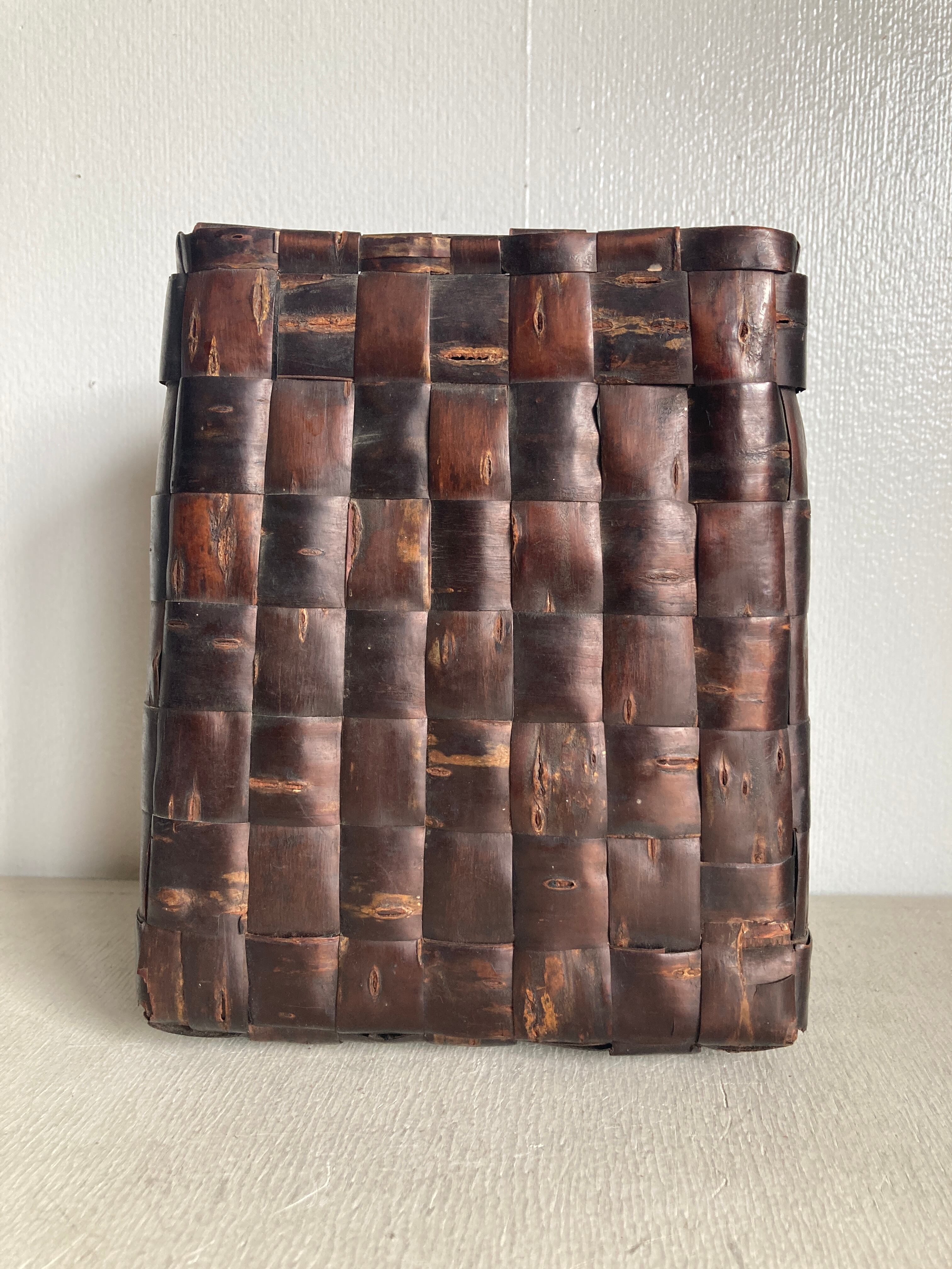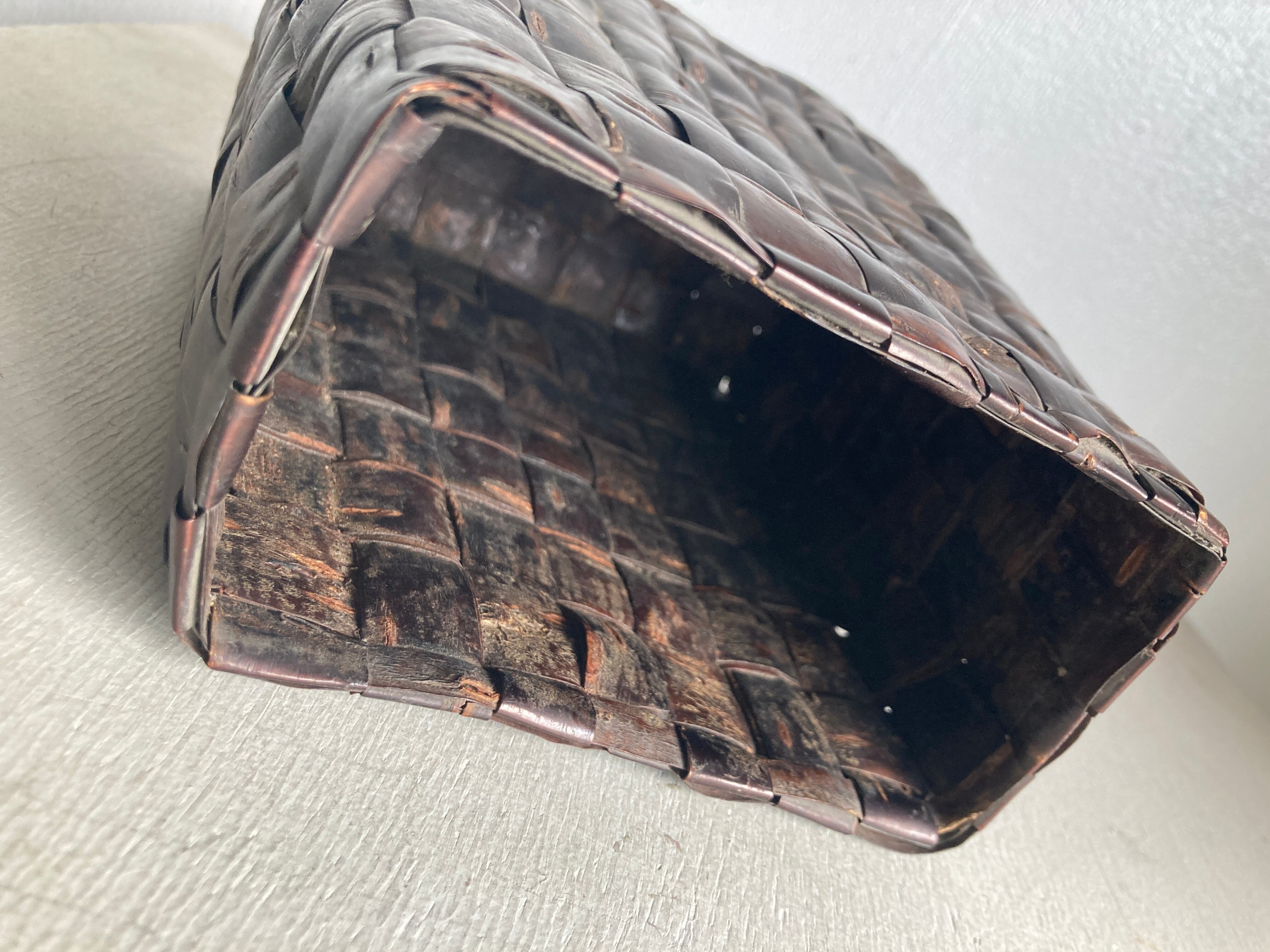 樺の樹皮を割り裂いてそのまま編み込み旅持ち籠として仕立てられたもの。(出会った時には明治時代のものと思しき和更紗の袋が口元に縫い止められておりましたが、経年と使用で布のリキも損なわれておりましたためこちらで取り外し、改めて花籠としてご提案させていただきます)