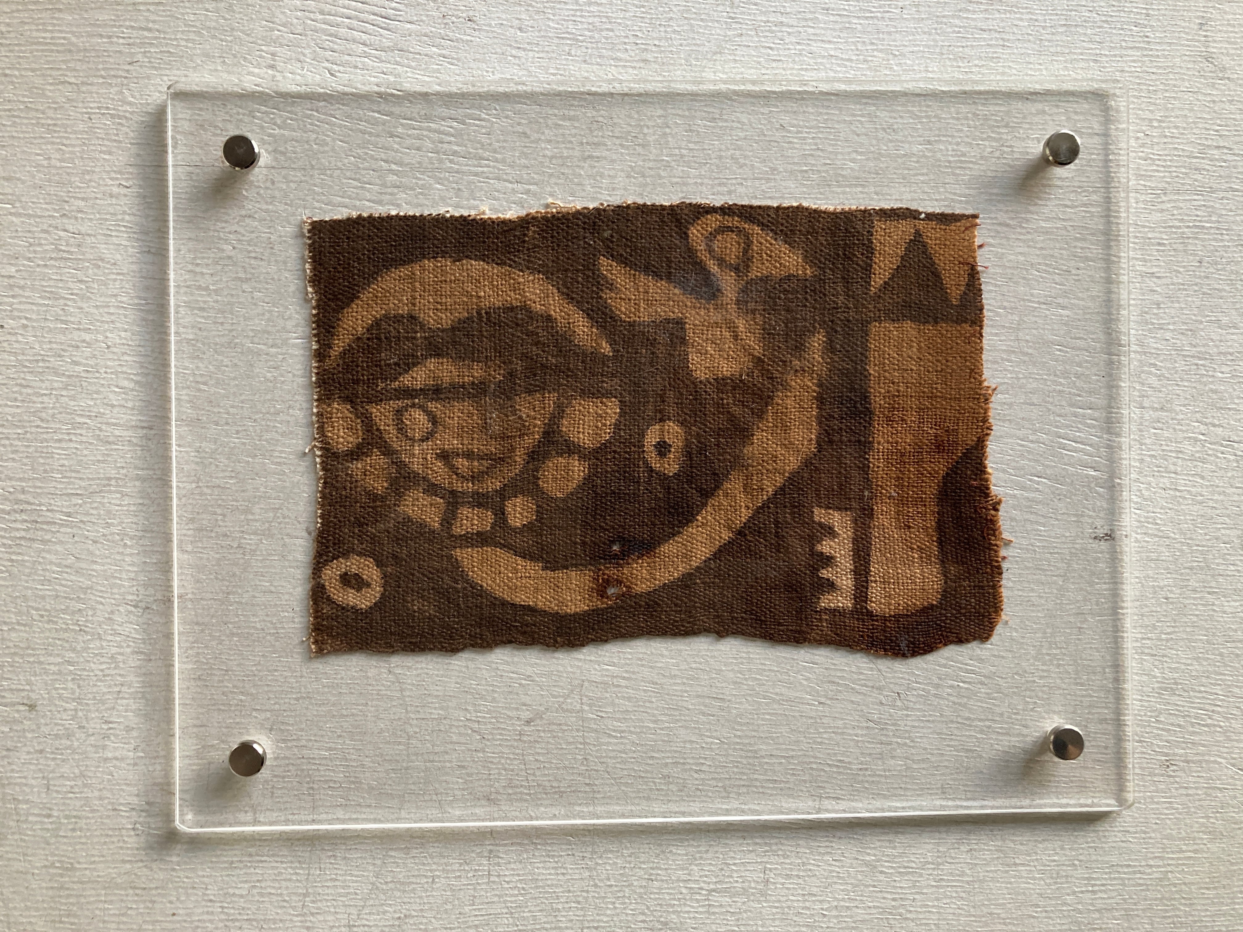 ○ こちらは、王冠を身に付けた(手に刀のようなものも)人物と鳥が描かれた木綿布の断片(1辺に布の耳が残っています)