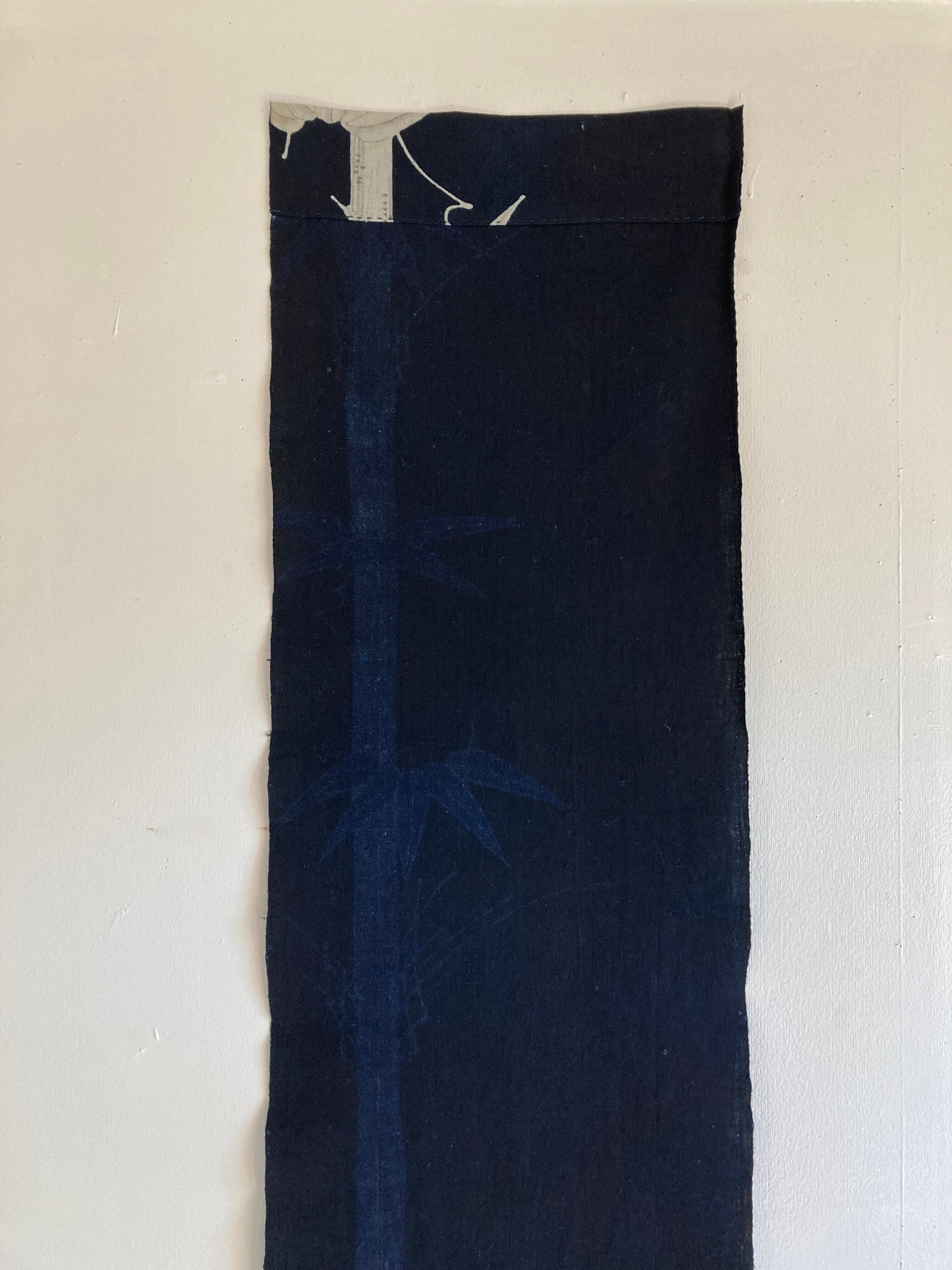 (暖簾として仕立てられたおりに棒通しになっていた上部の輪の部分もそのままに残してございます、丸棒などで掛け軸のように吊るして壁面などでお楽しみいただいても。またはテーブルランナーの用でお愉しみ頂いても○)