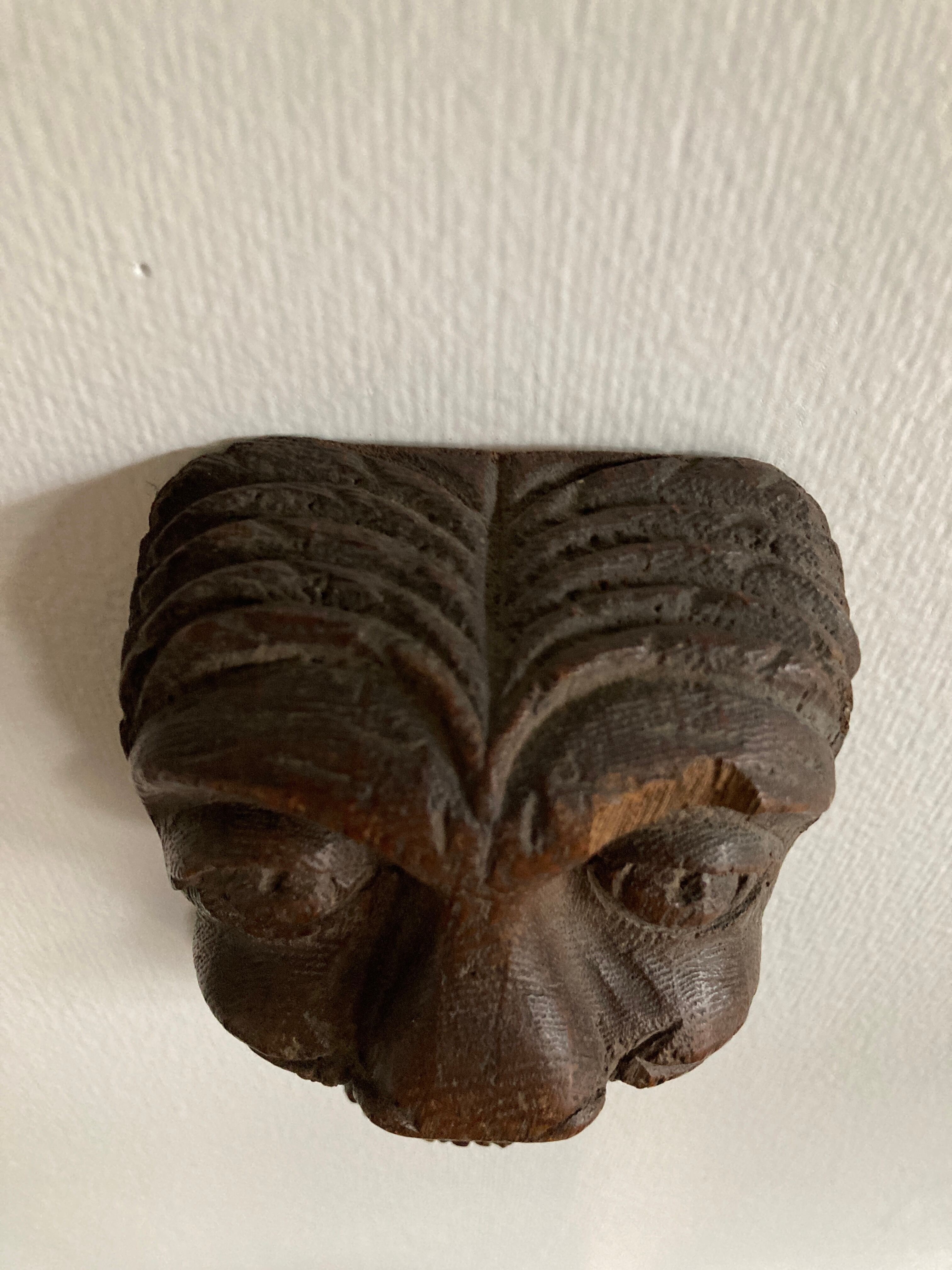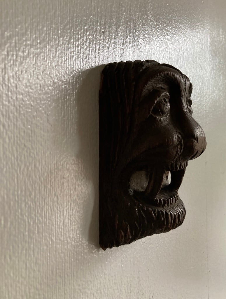 本来はコファー(私財などを仕舞うための収納家具)あるいはドアなどの建具に、番人的な意味合いと装飾の用を兼ねて彫られ、取り付けられていたレリーフとなります。