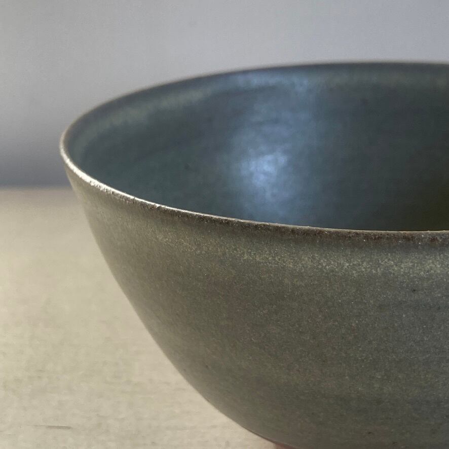 釉薬:やや黄味を帯びたブルーグレーの色相、森を包む朝霧の情景のよう。口縁の釉だまりや鉄縁、見込みの窯変が景色となっています。